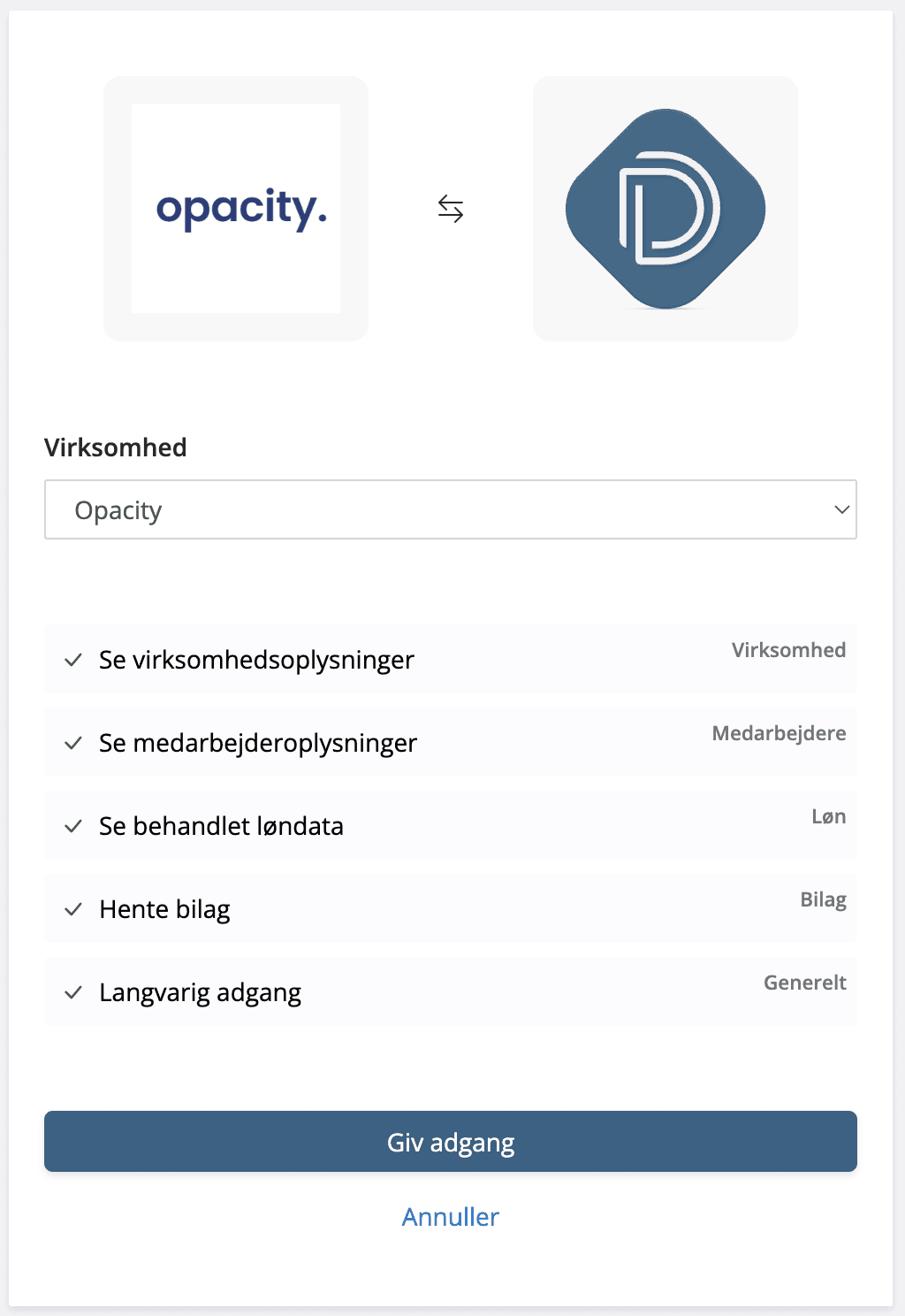 Denne guide viser dig trin for trin, hvordan du forbinder Opacity med DataLøn.